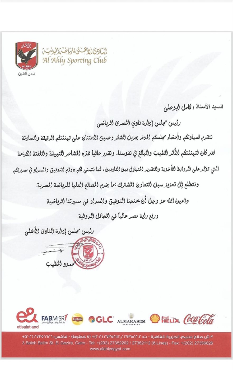 وختم الأهلي خطابه بتمنياته للنادي المصري بمزيد من النجاح والتوفيق في المرحلة المقبلة لرفع راية الرياضة المصرية.