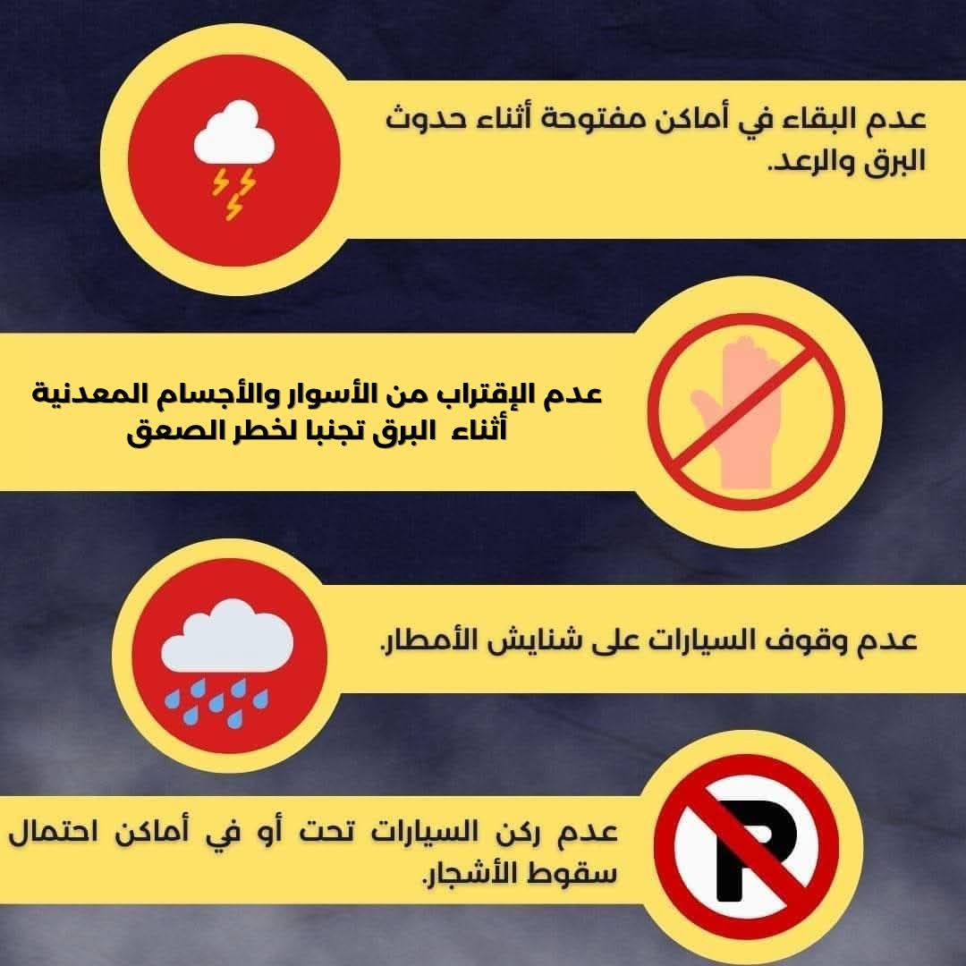 وضرورة تجنب استخدام الهواتف السلكية أو المعدات الكهربائية أثناء البرق، وعلى قائدي المركبات تخفيف السرعة والالتزام بالمسارات المحددة لتفادي الحوادث.