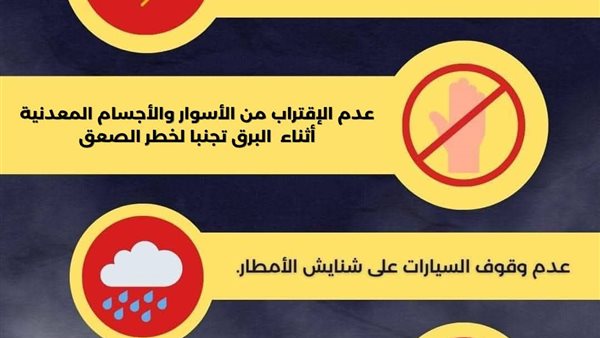 وطالب البيان بالابتعاد عن الأسوار المعدنية وأسلاك الكهرباء وأعمدة الإنارة،و فصل الأجهزة الكهربائية بالمنازل والمحال أثناء العواصف القوية.