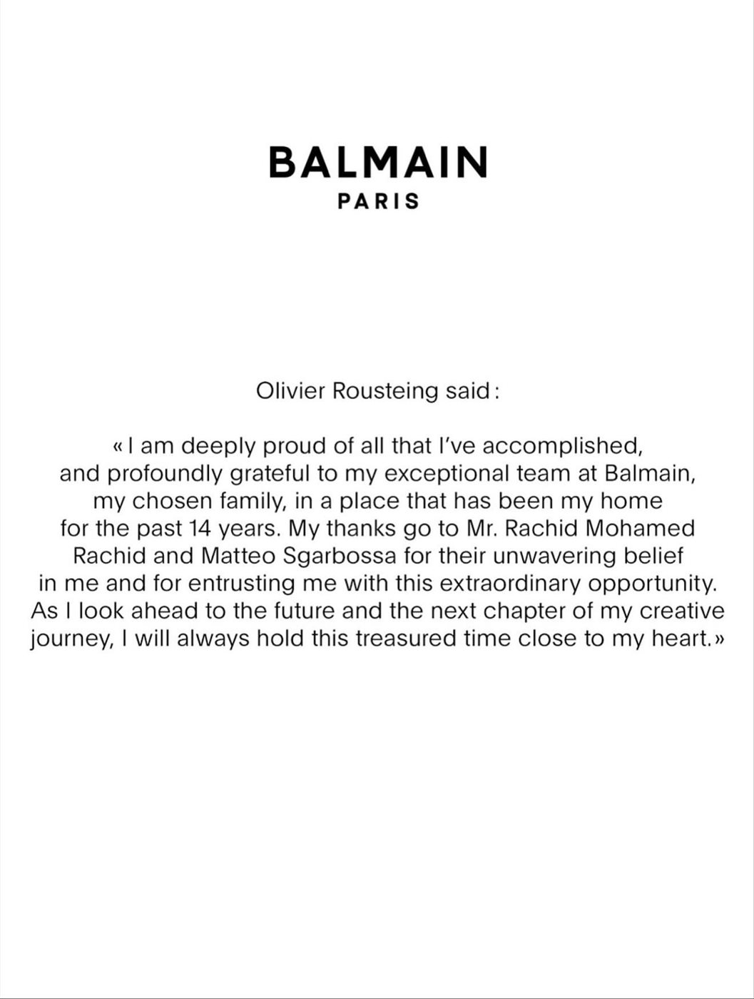 كما قال ماتيو سغاربوسا، الرئيس التنفيذي لدار بالمان: “أود أن أعبّر عن بالغ امتناني لأوليفييه على كتابته فصلاً مهماً في تاريخ الدار. إن مساهماته وشغفه عبر السنوات ستبقى علامة لا تُمحى في تاريخ الموضة”.