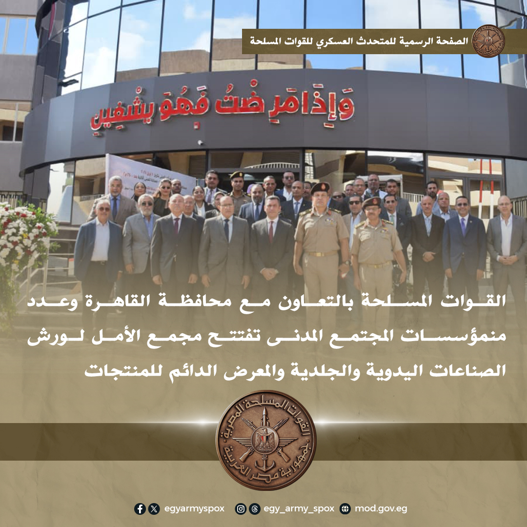 تنفيذاً لتوجيهات السيد الرئيس عبد الفتاح السيسى رئيس الجمهورية القائد الأعلى للقوات المسلحة بدعم مقومات التنمية الحضارية وتوفير الحياة الكريمة للمواطنين بالمناطق السكنية غير المخططة الجارى تطويرها ، إفتتحت القوات المسلحة بالتعاون مع محافظة القاهرة وعدد من مؤسسات المجتمع المدنى مجمع الأمل لورش الصناعات اليدوية والجلدية والمعرض الدائم لمنتجات الجلود والذى تم تنفيذه على مساحة ( 4 ) فدان بمدينة الأمل ويضم عدد ( 107 ) ورشة للصناعات الجلدية ومعرض دائم لبيع المنتجات الجلدية فضلاً عن عدد من المنشآت الإدارية ومستشفى خيرى تضم مختلف التخصصات الطبية لخدمة أهالى المنطقة .