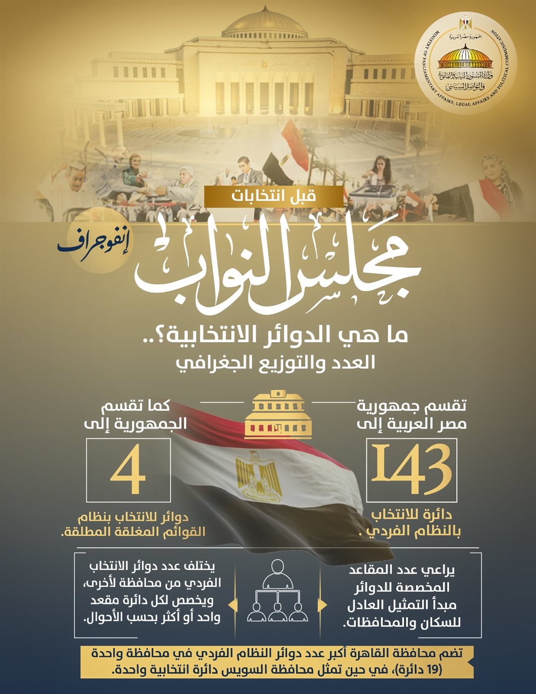 أصدرت وزارة الشؤون النيابية والقانونية والتواصل السياسي بيانًا، اليوم الخميس، قالت فيه إنها في إطار استمرار الدور الذي تقوم به في زيادة الوعي الانتخابي، وفي إطار تفعيل جانب التواصل السياسي، فإنها تنشر اليوم إنفوجرافًا لتعريف المواطنين بالهيئة الوطنية للانتخابات.. دورها في إدارة الانتخابات.. اختصاصاتها.. استقلالها.. أعضائها، وإنفوجرافًا ثان، يتعلق بكل المعلومات عن الدوائر الانتخابية.. العدد والتوزيع الجغرافي.