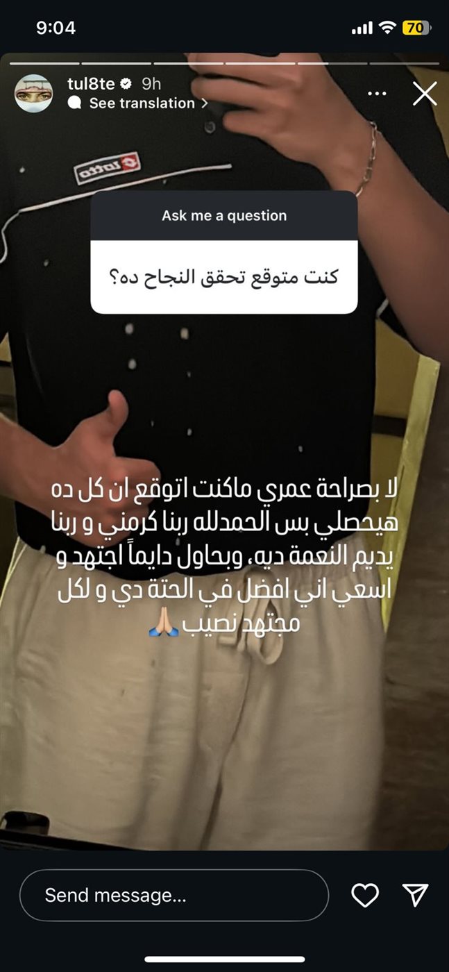 تساءل أحد متابعي المطرب تووليت عن توقعه من البداية لمدى نجاحه الآن، ليرد عليه تووليت من خلال منشور على خاصية الأستوري عبر حسابه الرسمي على موقع تبادل الصور والفيديوهات إنستجرام.