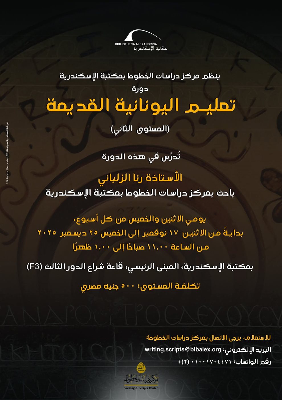 ينظم مركز دراسات الخطوط بقطاع البحث الأكاديمي بمكتبة الإسكندرية دورتين لتعليم اليونانية القديمة، مستوى أول ومستوى ثانٍ، وذلك بدءًا من 16 نوفمبر وحتى 28 ديسمبر 2025، يومي الأحد والأربعاء (المستوى الأول)، والاثنين والخميس (المستوى الثاني) من كل أسبوع. يقوم بالتدريس في الدورتين الأستاذة رنا الزلباني، باحث بمركز دراسات الخطوط بمكتبة الإسكندرية.
