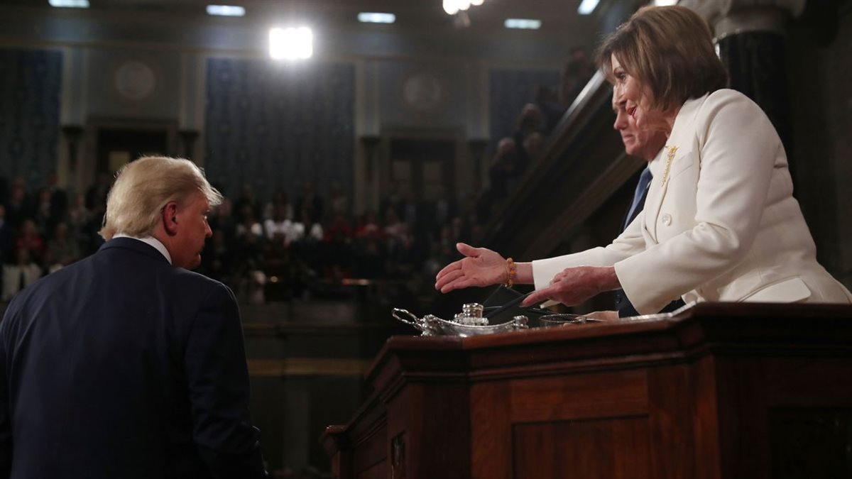 وكانت العداوة بين بيلوسي وترامب قد بلغت ذروتها خلال خطاب حالة الاتحاد عام 2020، عندما رفض ترامب مصافحتها أثناء دخوله إلى قاعة مجلس النواب، وردت بيلوسي في نهاية الخطاب بتمزيق النسخة الورقية منه على نحو دراماتيكي، قائلة لاحقًا إنها فعلت ذلك لأن "كل صفحة فيه تحتوي على كذبة.