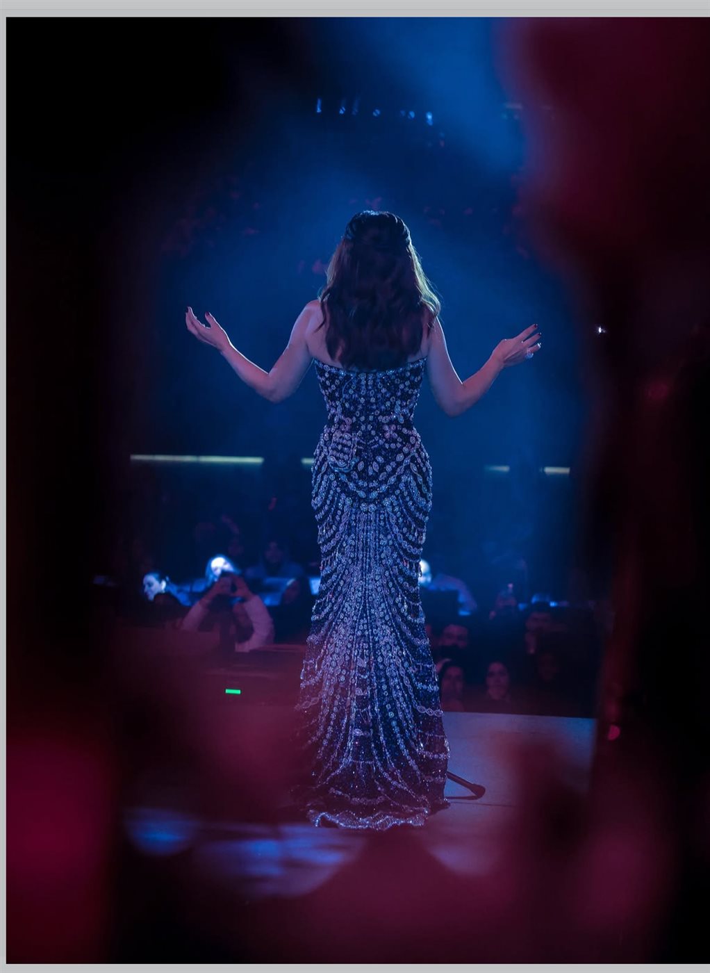 وخلال الحفل، تألقت النجمة أنغام، بفستان طويلاً باللون الأسود بتصميم عصري بتفصيلة الكب المرصّع بالكامل بلمسات الذهبي والفضي بالإضافة إلى الأحجار الملونة حمل توقيع مصمم الأزياء اللبناني والعالمي إيلي صعب ومشاركة وتنسيق الستايلست يمنى مصطفى.