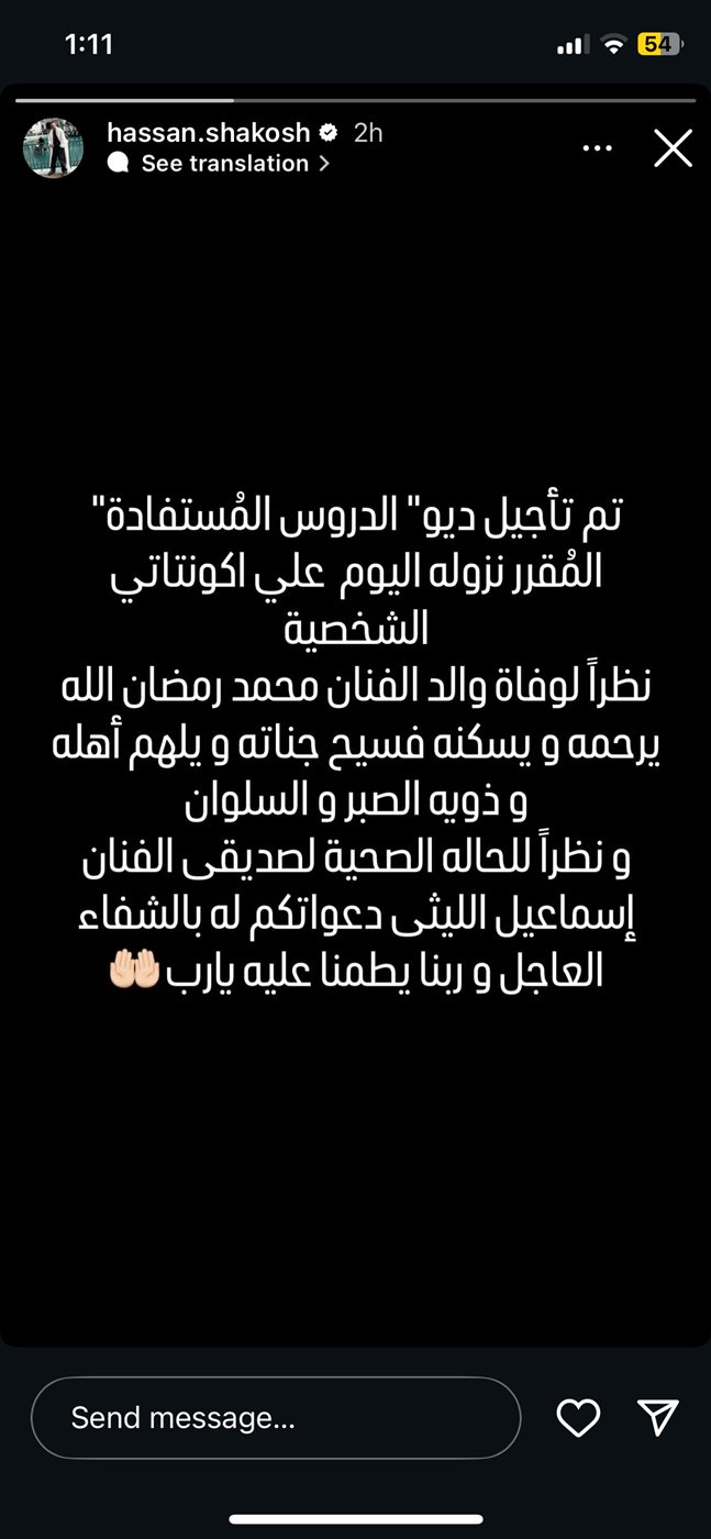 وأعلن حسن شاكوش عن ذلك من خلال منشورًا عبر حسابه الرسمي على موقع تبادل الصور والفيديوهات إنستجرام، حيث قال: "تم تأجيل ديو" الدروس المُستفادة"، المُقرر نزوله اليوم علي اكونتاتي الشخصية، نظراً لوفاة والد الفنان محمد رمضان الله يرحمه ويسكنه فسيح جناته و يلهم أهله وذويه الصبر و السلوان، ونظراً للحاله الصحية لصديقى الفنان إسماعيل الليثى دعواتكم له بالشفاء العاجل وربنا يطمنا عليه يارب".
