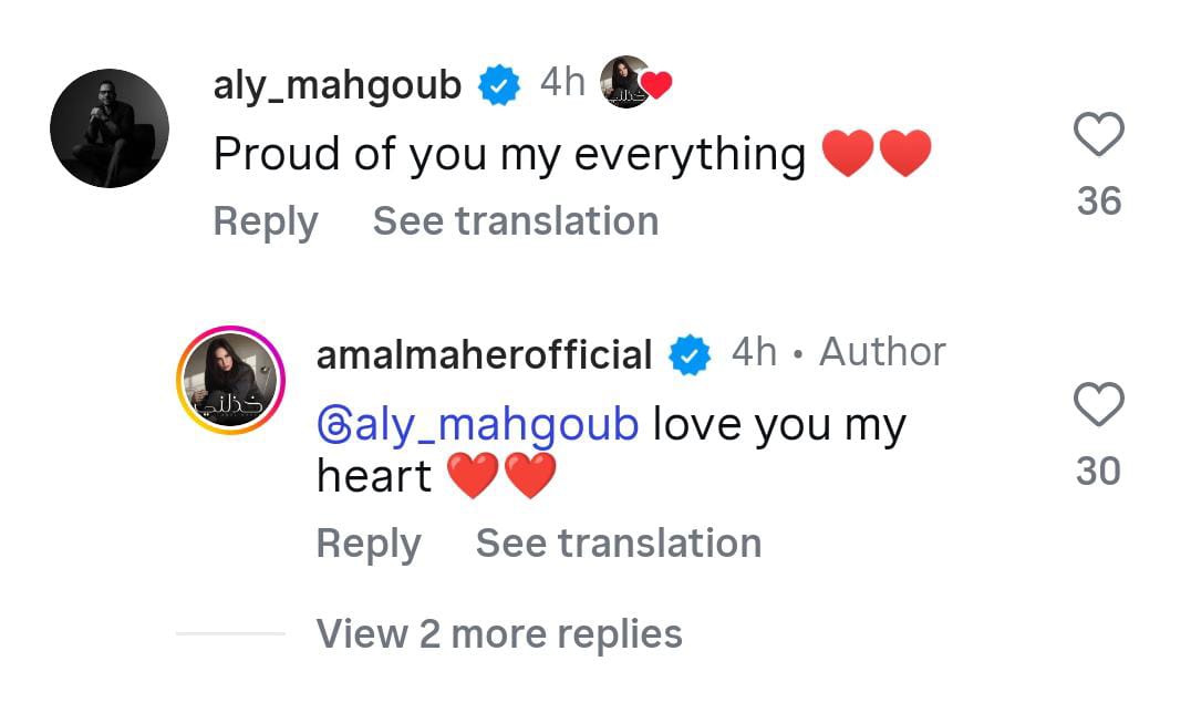 حيث علق رجل الأعمال علي محجوب على الصور قائلًا: “فخور بكِ يا كل شيء بالنسبة لي”، لترد عليه آمال ماهر مؤكدة: “قلبي.. أحبك.”