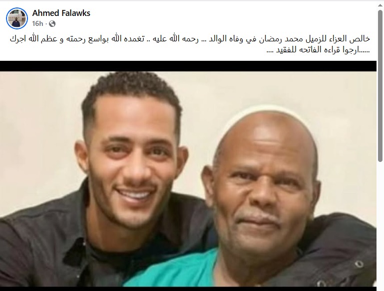 وكتب رمضان: “إنا لله وإنا إليه راجعون شكرًا جزيلا لكل من قدم العزاء وواساني في وفاة والدي الحبيب، ويُقام العزاء يوم الأحد في مسجد الشرطة بمدينة الشيخ زايد، وجزاكم اللّٰه خيرًا ولا أراكم اللّٰه مكروها في عزيز لديكم”.