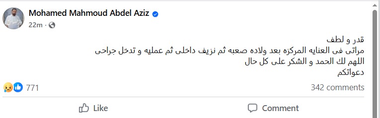 وكتب محمد محمود عبد العزيز عبر حسابه الرسمي على موقع فيس بوك: قدر ولطف.. مراتي في العناية المركزة بعد ولادة صعبة ثم نزيف داخلي ثم عملية وتدخل جراحي، اللهم لك الحمد والشكر على كل حال.. دعواتكم.