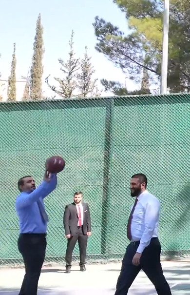 الرئيس الشرع يمارس كرة السلة داخل ملاعب القصر الجمهوري بدمشق برفقة الشيباني