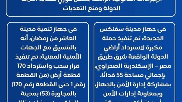 وفي هذا الإطار، أوضح جهاز مدينة سفنكس الجديدة، أنه تم تنفيذ حملة مكبرة لاسترداد أراضي الدولة الواقعة شرق طريق مصر – الإسكندرية الصحراوي، بإجمالي مساحة 55 فدانًا، بمشاركة إدارة الأمن بالجهاز، وبمعاونة إدارات الأمن بأجهزة أكتوبر، وحدائق أكتوبر، وأكتوبر الجديدة، وزايد، وذلك تحت تأمين من شرطة التعمير بمدينة سفنكس الجديدة .