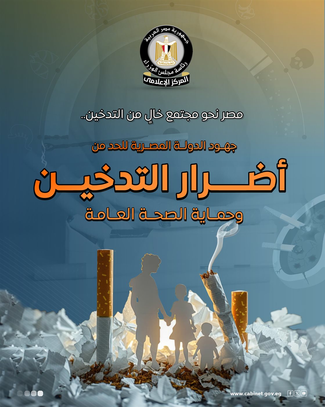 نشر المركز الإعلامي لمجلس الوزراء عددًا من الإنفوجرافات عبر منصاته على مواقع التواصل الاجتماعي، سلط من خلالها الضوء على جهود الدولة للحد من أضرار التدخين وحماية الصحة العامة.