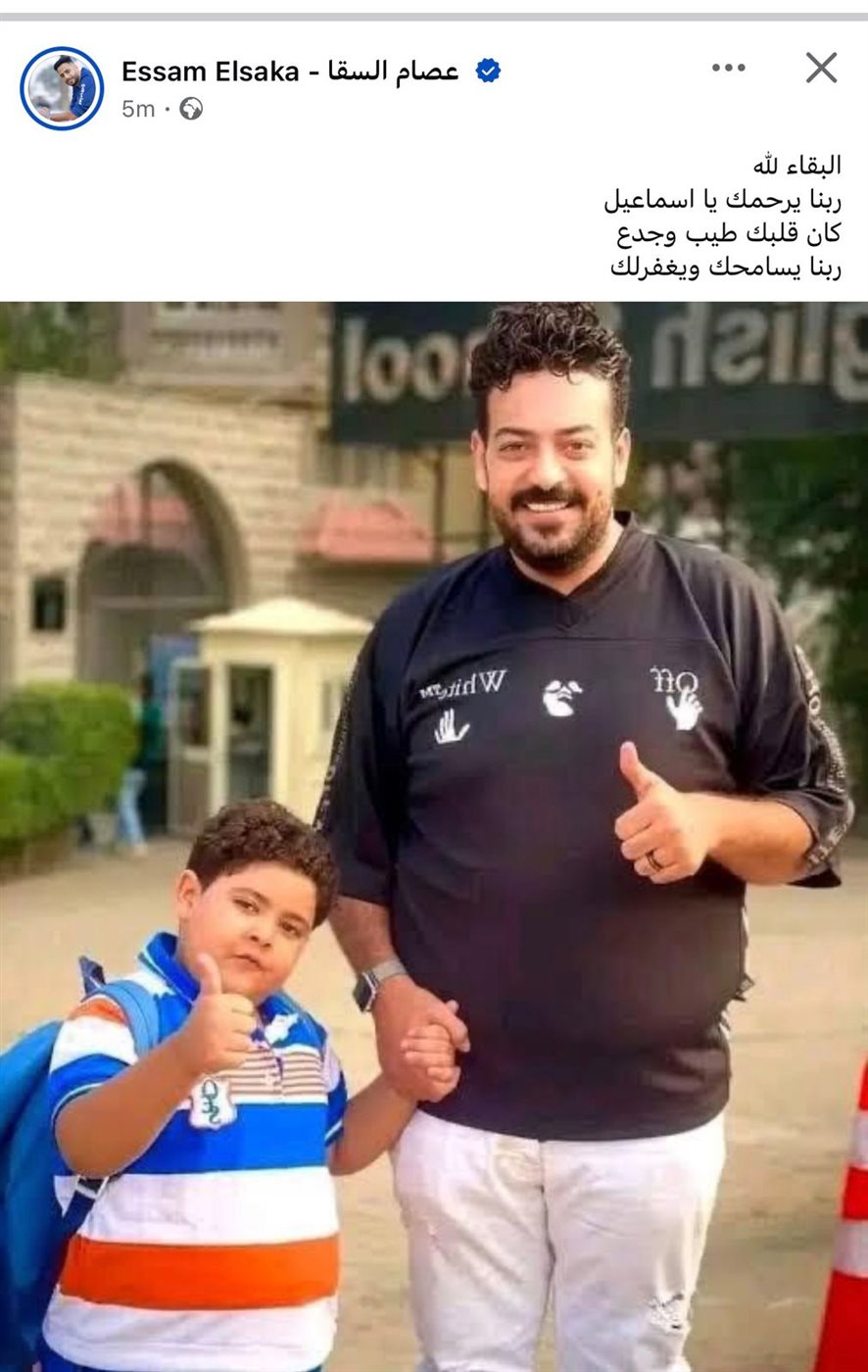وقال "عصام السقا" في منشور له عبر موقع التواصل الإجتماعي "فيسبوك": "البقاء لله، ربنا يرحمك يا إسماعيل، كان قلبك طيب وجدع، ربنا يسامحك ويغفرلك".