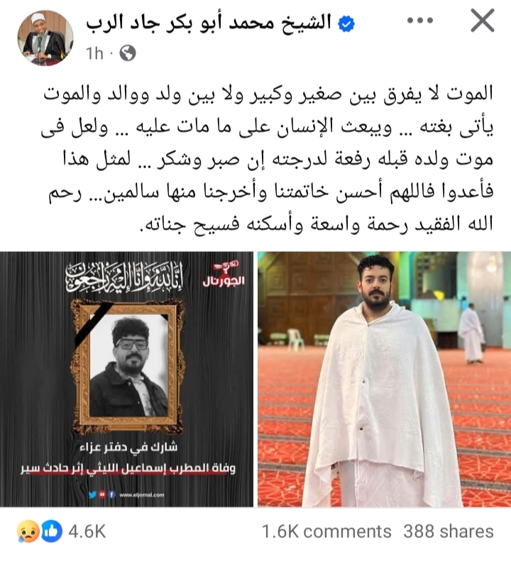 نعى الشيخ محمد أبو بكر جاد المطرب الشعبي إسماعيل الليثي، الذي وافته المنية اليوم متأثرًا بإصاباته جراء حادث تعرض له قبل أيام، نُقل على إثره إلى العناية المركزة.
