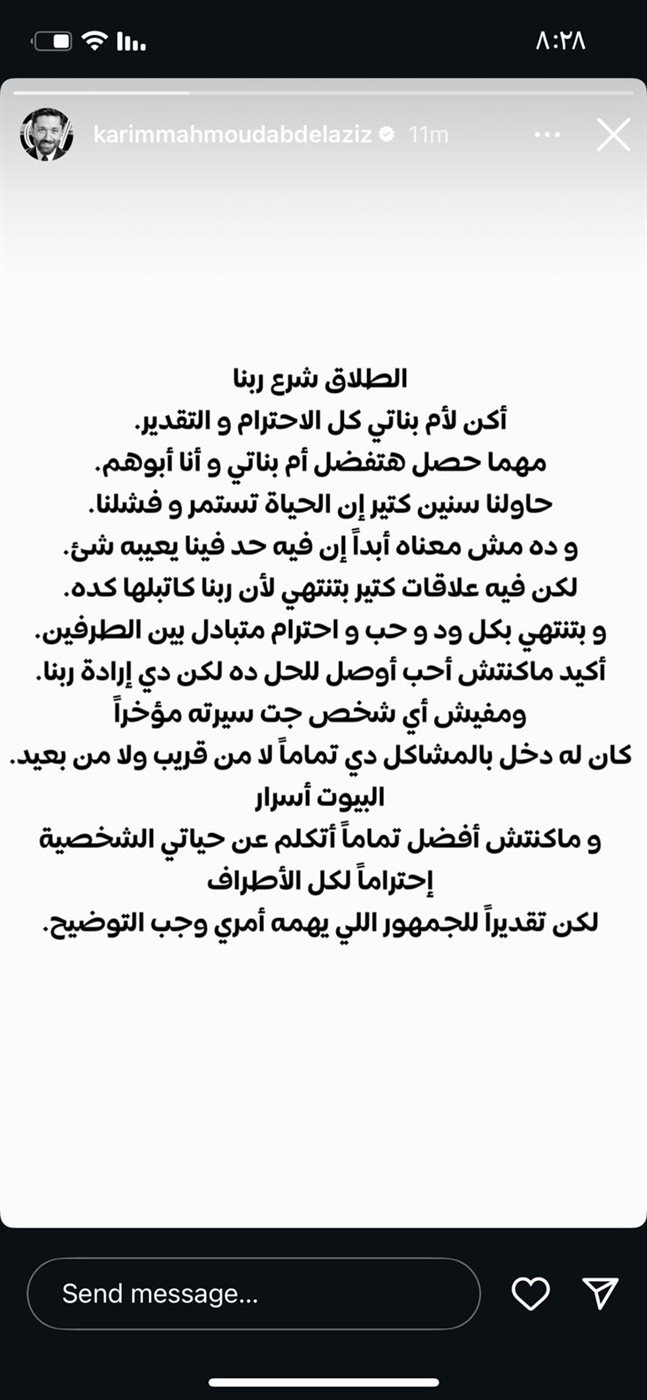 وكتب كريم محمود عبدالعزيز : الطلاق شرع ربنا أكن لأم بناتي كل الاحترام والتقدير مهما حصل هتفضل أم بناتي وأنا أبوهم حاولنا سنين كتير إن الحياة تستمر وفشلنا وده مش معناه أبداً إن فيه حد فينا يعيبه شئ لكن فيه علاقات كتير بتنتهي لأن ربنا كاتبلها كده وبتنتهي بكل ود وحب واحترام متبادل بين الطرفين.