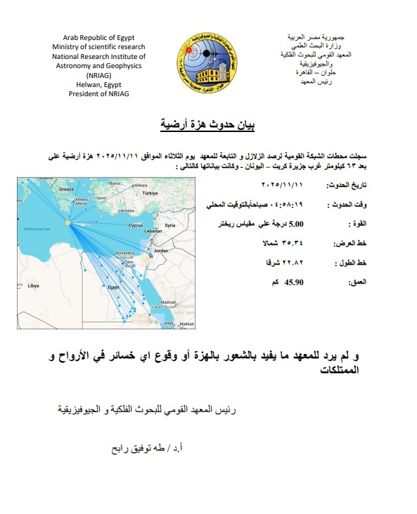 سجلت محطات الشبكة القومية لرصد الزلازل و التابعة للمعهد القومي للبحوث الفلكية والجيوفيزيقية، اليوم الثلاثاء 11 نوفمبر 2025، هزة أرضية على بعد 63 كيلومتر غرب جزيرة كريت باليونان.