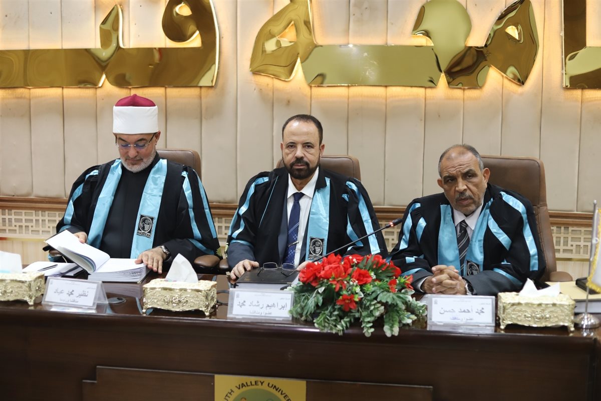 وضمّت لجنة المناقشة كل من الدكتور إبراهيم رشاد محمد صبري أستاذ أصول الفقه ومقاصد الشريعة بكلية الآداب جامعة قنا عضواً مناقشاً، والدكتور محمد أحمد حسن محمود الخولي أستاذ الفقه المقارن بكلية الآداب جامعة قنا عضواً مشرفاً، بينما أشرف على الرسالة كلا من الدكتور محمد أحمد حسن محمود الخولي أستاذ الفقه المقارن بكلية الآداب جامعة قنا والدكتور أحمد عبد النعيم عامر أستاذ الفقه المساعد بكلية الآداب جامعة أسيوط.