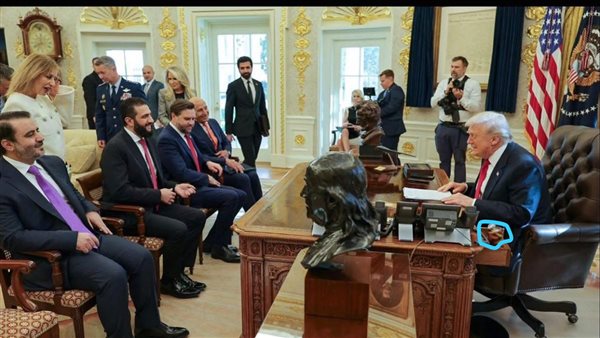 تداول العديد من مستخدمي مواقع التواصل الاجتماعي صورة من اجتماع الرئيس الأمريكي دونالد ترامب مع نظيره السوري أحمد الشرع، خلال لقائهما مساء أمس الاثنين في البيت الأبيض، والتي ظهر فيها مشروب ترامب المفضل موضوعًا داخل أحد الأدراج.