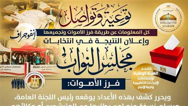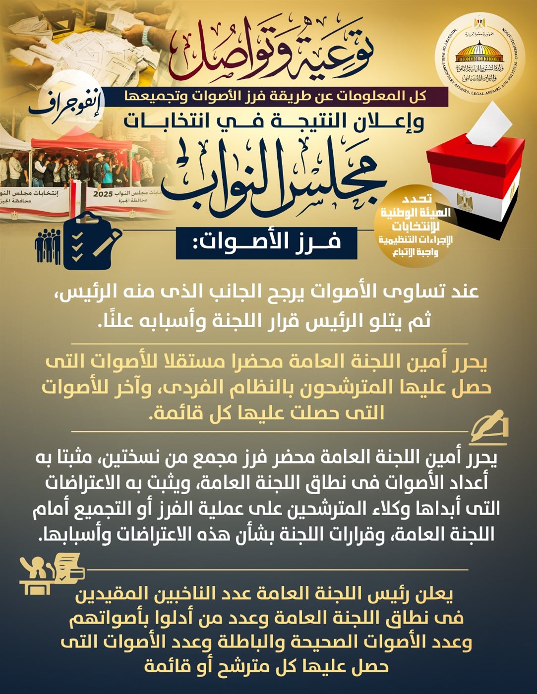 أصدرت وزارة الشؤون النيابية والقانونية والتواصل السياسي بيانًا اليوم الثلاثاء 11 نوفمبر 2025، قالت فيه إنه استمرارًا لسلسلة المحتوى التوعوي الذي بدأته الوزارة تحت شعار "توعية وتواصل"، نشرت اليوم مجموعة إنفوجرافات سياسية توعوية قدمت فيها معلومات بشأن كل ما يتعلق بعمليات فرز الأصوات، وذلك بالتزامن مع بدء اليوم الثاني والأخير في انتخابات المرحلة الأولى، لمجلس النواب 2025.