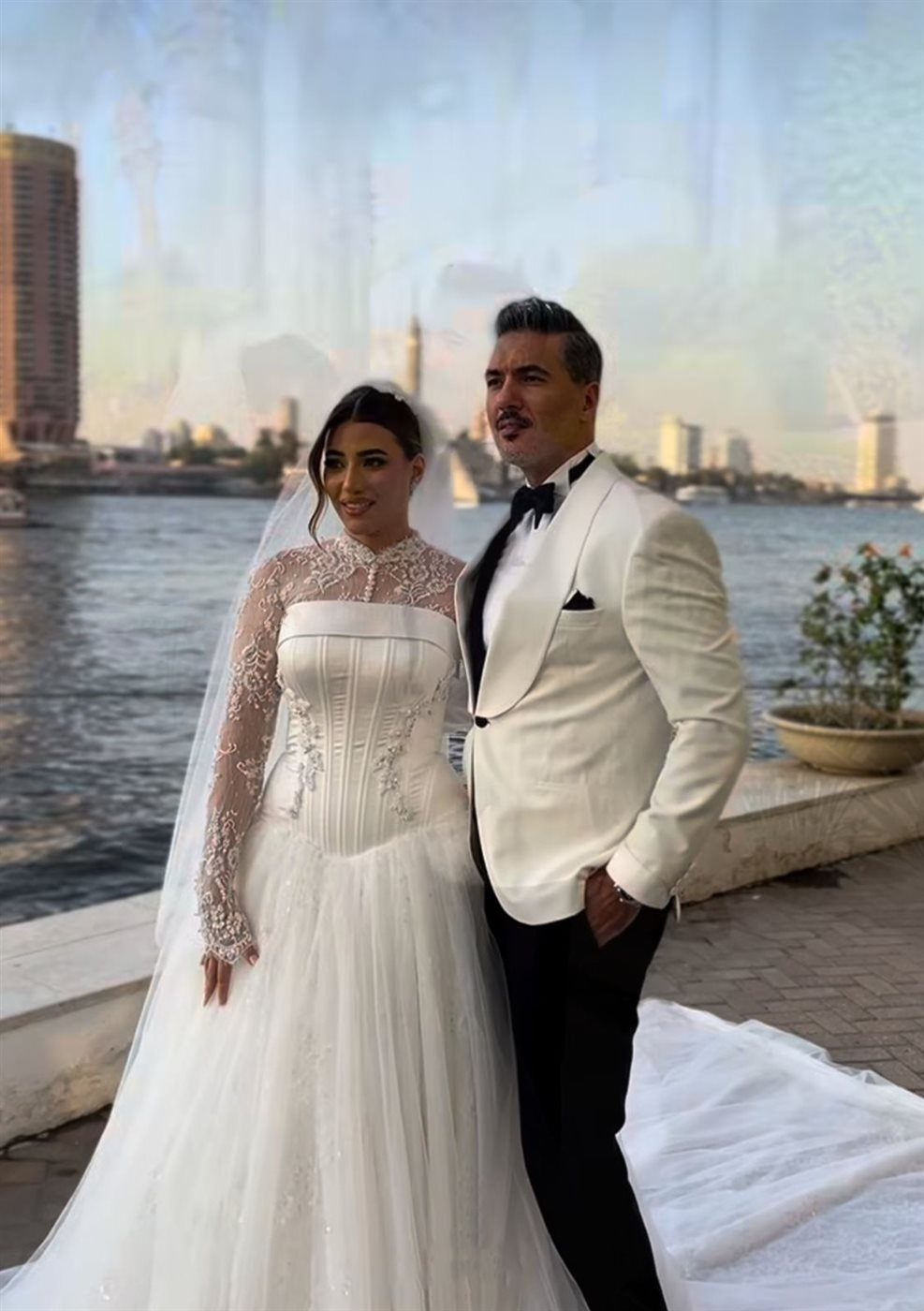 ارتدت العروس فستان أبيض طويلاً غني بالتول وبتصميم الكورسيه الضيق من توقيع مصممة الأزياء فاطمة نصر.