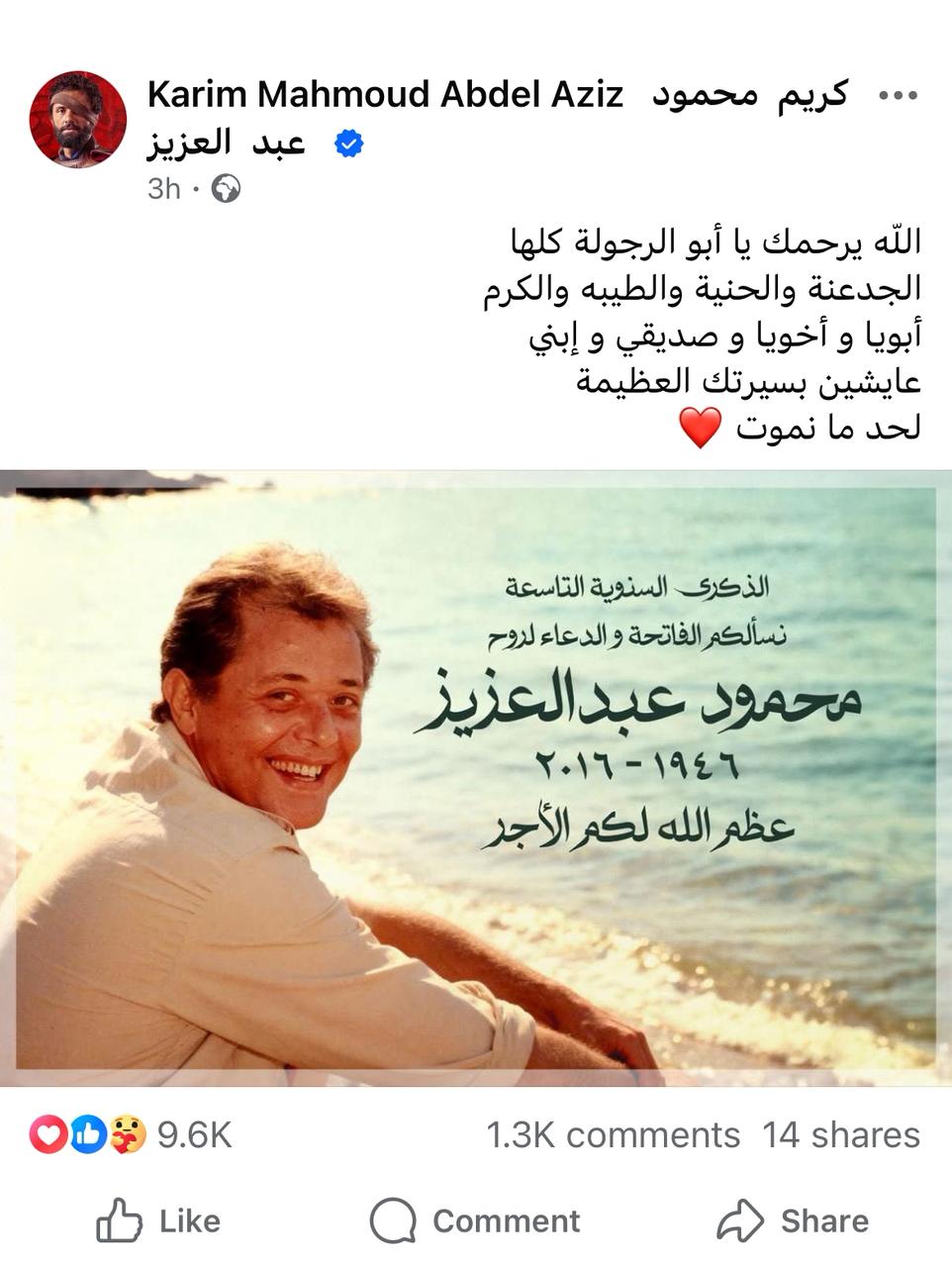 وكتب كريم محمود عبّد العزيز عبر حسابه بموقع فيسبوك: اللّه يرحمك يا أبو الرجولة كلها الجدعنة والحنية والطيبة والكرم أبويا وأخويا وصديقي وابني عايشين بسيرتك العظيمة لحد ما نموت.
