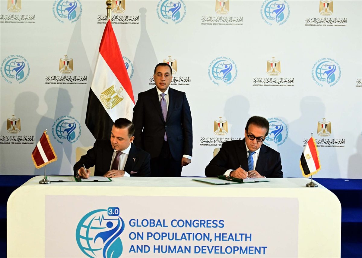 شهد الدكتور مصطفى مدبولي، رئيس مجلس الوزراء، اليوم؛ مراسم توقيع مذكرة تفاهم للتعاون في مختلف مجالات الرعاية الصحية بين وزارة الصحة والسكان بجمهورية مصر العربية، ووزارة الصحة بجمهورية لاتفيا، وذلك على هامش حضوره فعاليات النسخة الثالثة للمؤتمر العالمي للسكان والصحة والتنمية البشرية (PHDC’25)، الذي يُعقد خلال الفترة من 12 إلى 15 نوفمبر الجاري، بالعاصمة الجديدة، تحت رعاية الرئيس عبد الفتاح السيسي، رئيس الجمهورية.