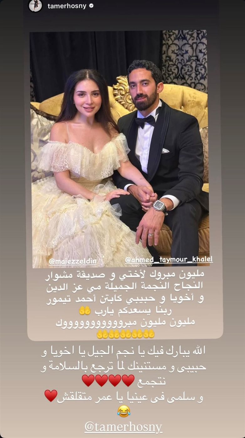 وعبر خاصية القصص القصيرة بحسابه على إنستجرام كتب: مليون مبروك لأختي وصديقة مشوار النجاح، النجمة الجميلة مي عز الدين، وأخويا وحبيبي كابتن أحمد تيمور ربنا يسعدكم يارب مليون مبروك.
