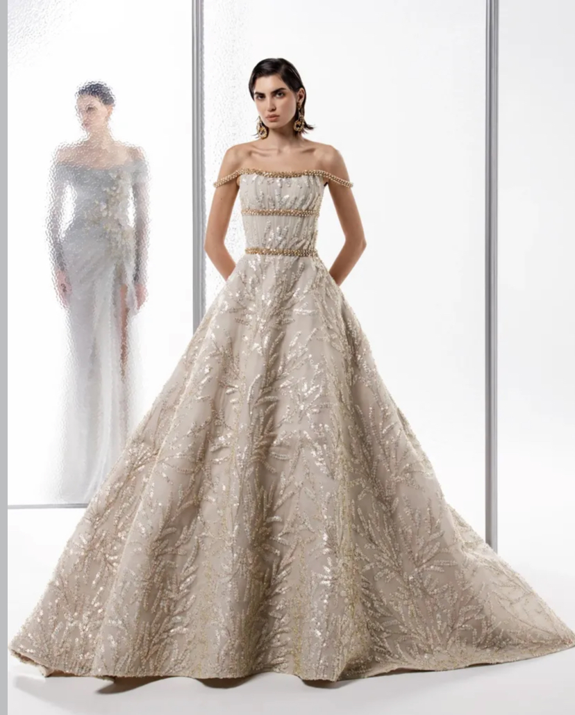 وأضاف أمّا الأقمشة، فقد تنوّعت بين الحرير وتول الحرير وكريب الحرير والتافتا والرازمير والكريب جورجيت والميكادو مانحةً كلّ قطعة خصوصيّة وتموّجاً مُميّزاً يعكس الحرفيّة العالية التي يتميّز بها نجا سعادة.