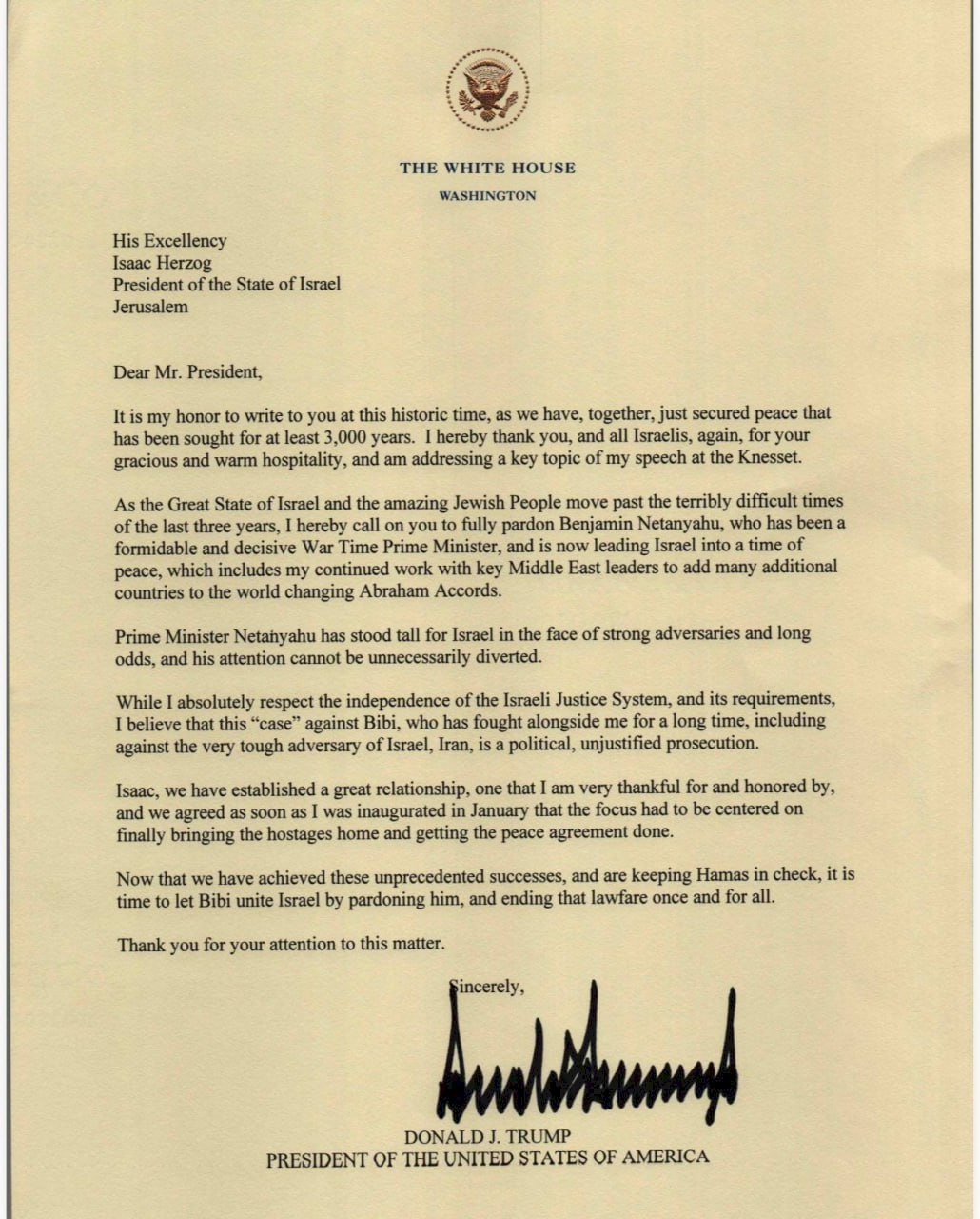 تلقى الرئيس الإسرائيلي إسحاق هرتسوغ رسالة رسمية من الرئيس الأمريكي دونالد ترامب، يطالب بها إلى النظر في منح عفو لرئيس الحكومة الإسرائيلي بنيامين نتنياهو، الذي يواجه محاكمة بتهم تتعلق بالرشوة والاحتيال وخيانة الأمانة.