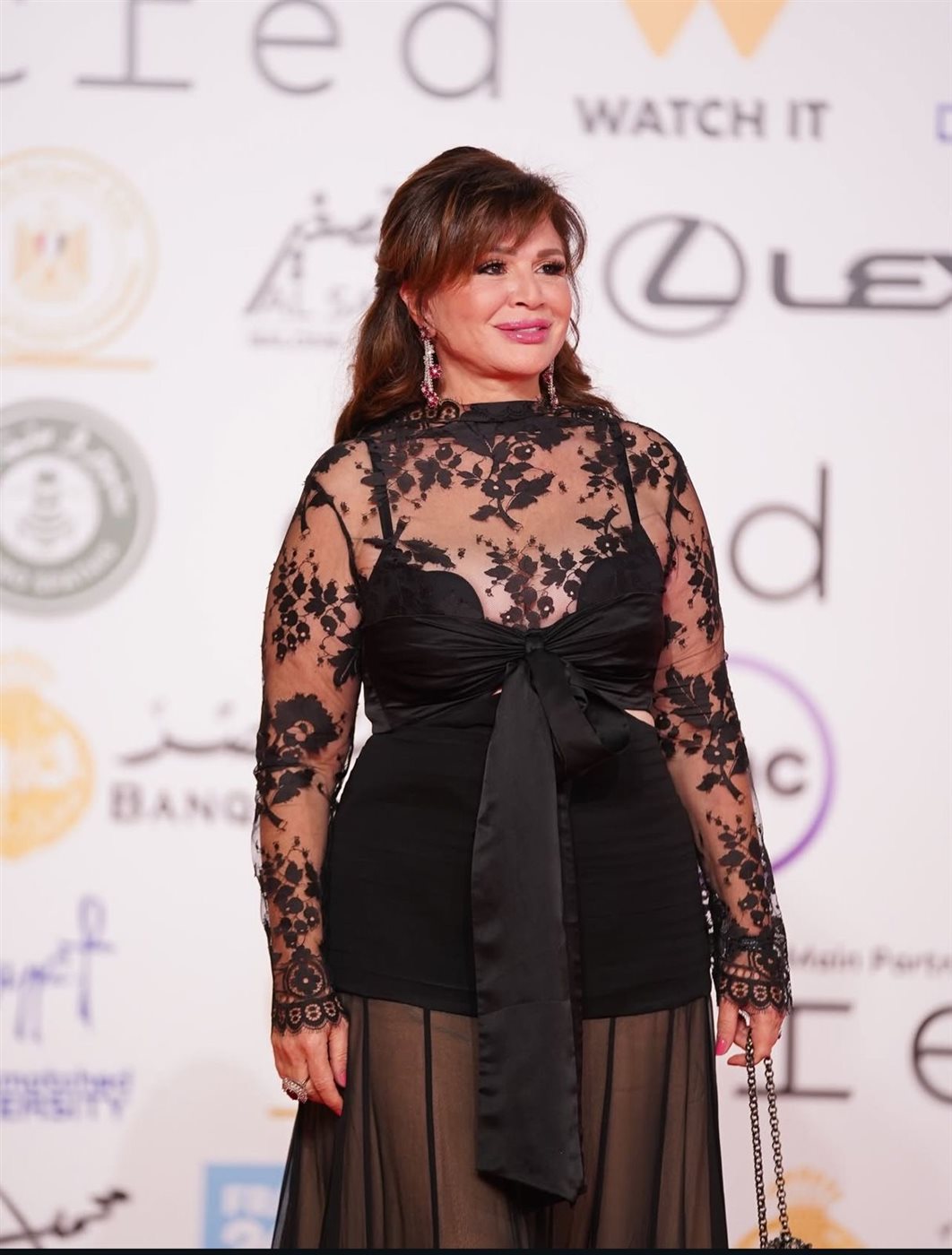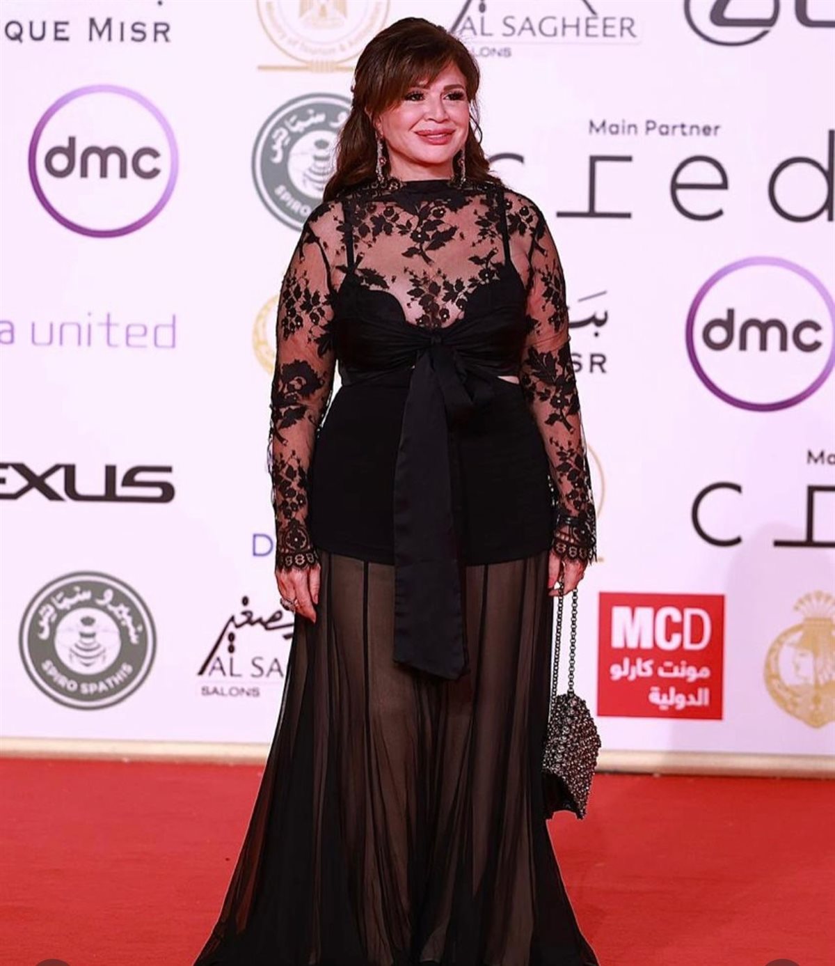 وارتدت الفنانة إلهام شاهين فستانا أسود اللون وجريئا ومكشوفا يتميز ببطانة قصيرة وشفافاً.