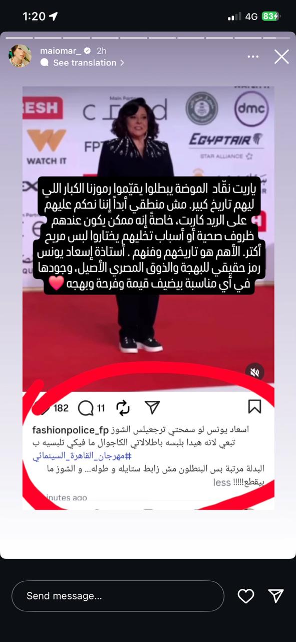 وكتبت مي عمر عبر حسابها الرسمي على موقع التواصل الإجتماعي إنستجرام : ياريت نقّاد الموضة يبطلوا يقيّموا رموزنا الكبار اللي ليهم تاريخ كبير مش منطقي أبداً إننا نحكم عليهم على الريد كاربت، خاصة إنه ممكن يكون عندهم ظروف صحية أو أسباب تخليهم يختاروا لبس مريح أكتر.