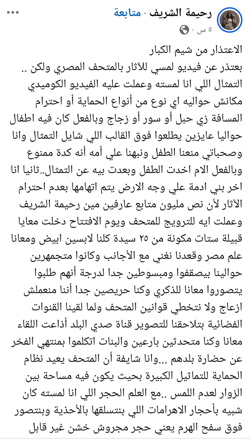 وكتبت رحيمة الشريف في منشور لها عبر حسابها على "فيسبوك": الاعتذار من شيم الكبار.. بعتذر عن فيديو لمسي للآثار بالمتحف المصري، ولكن التمثال اللي أنا لمسته وعملت عليه الفيديو الكوميدي مكانش حواليه أي نوع من أنواع الحماية أو احترام المسافة، زي حبل أو سور أو زجاج، وبالفعل كان فيه أطفال حواليَّ عايزين يطلعوا فوق القالب اللي شايل التمثال، وأنا وصحباتي منعنا الطفل ونبَّهنا على أمه إنه كده ممنوع، وبالفعل الأم أخدت الطفل وبعدت بيه عن التمثال.