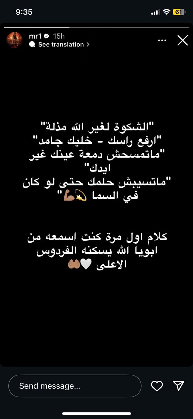 تذكر الفنان محمد رمضان كلمات مؤثرة، كان دائمًا والده يقولها له، وذلك من خلال خاصية الأستوري عبر حسابه الرسمي على موقع تبادل الصور والفيديوهات إنستجرام.
