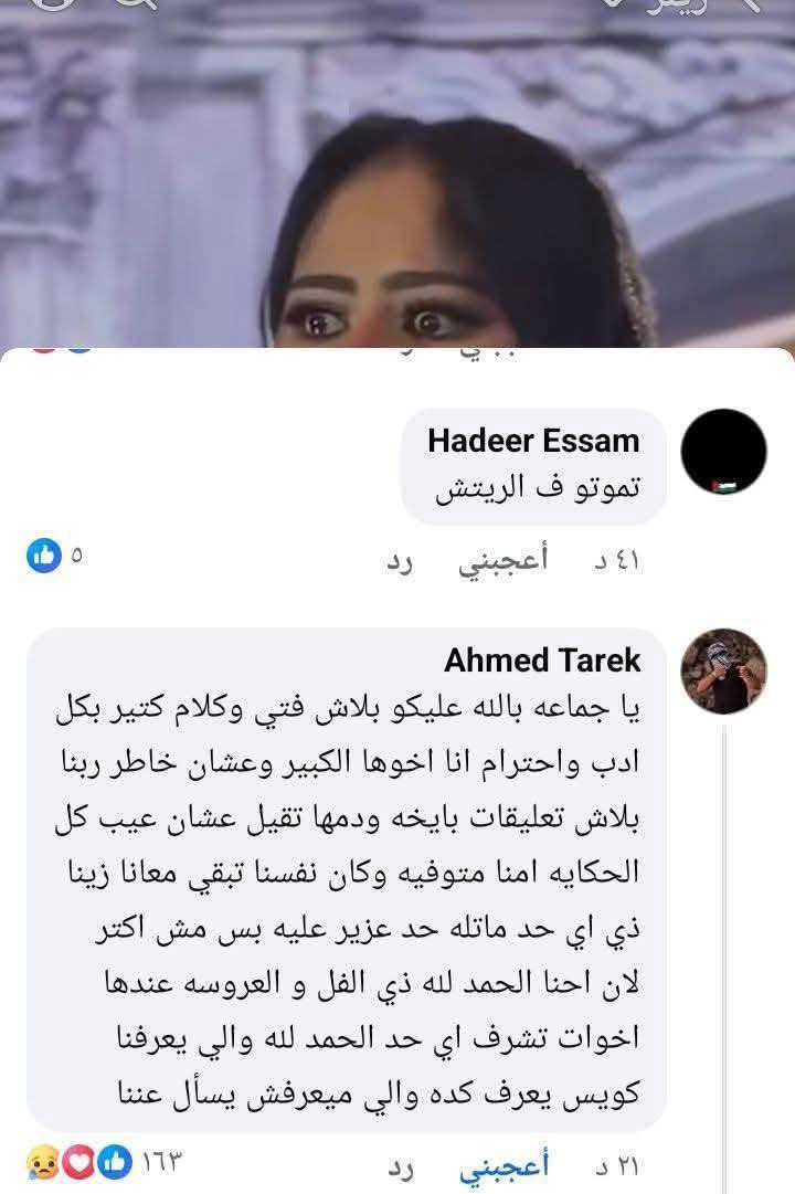 وقال صاحب حساب أحمد طارق: يا جماعة بالله عليكم بلاش فتي وكلام كتير بكل أدب واحترام، أنا أخوها الكبير، وعشان خاطر ربنا بلاش تعليقات بايخة ودمها تقيل، عشان عيب.