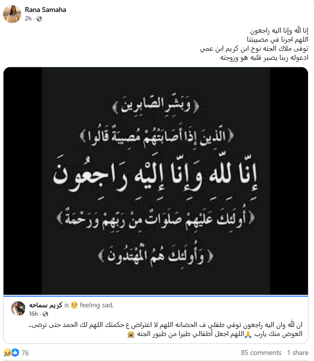حيث قالت رنا سماحة في منشورها: “إنا لله وإنا اليه راجعون، اللهم اجرنا في مصيبتنا، توفى ملاك الجنه نوح ابن كريم ابن عمي، ادعوله ربنا يصبر قلبه هو وزوجته”.