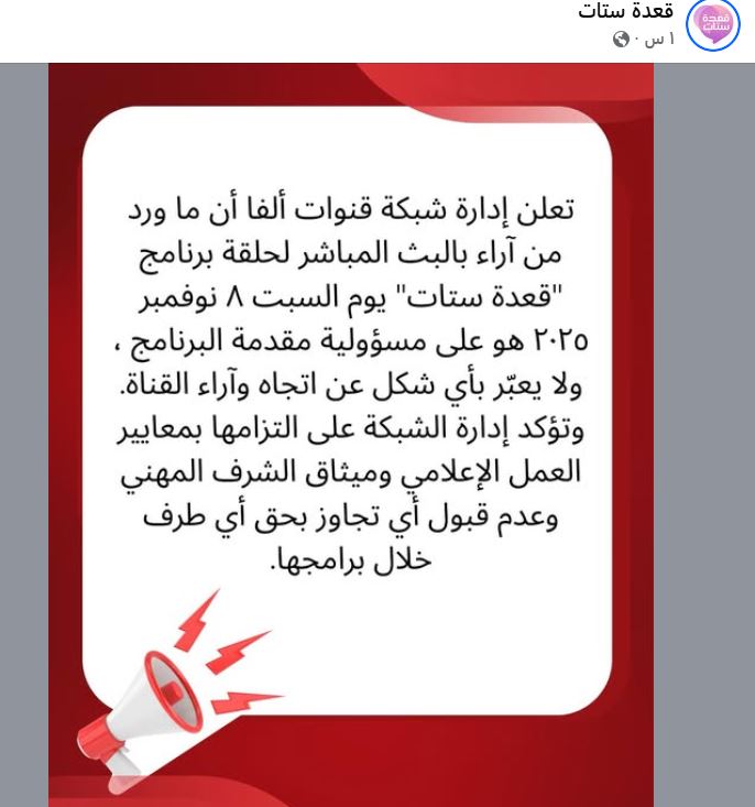 أصدرت إدارة شبكة قنوات "ألفا" بيانا أكدت فيه أن الآراء التي تم تداولها خلال البث المباشر لحلقة برنامج "قعدة ستات"، التي عرضت يوم السبت 8 نوفمبر 2020، تعبر عن رأي مقدمة البرنامج فقط، ولا تمثل بأي شكل من الأشكال توجه أو آراء القناة.