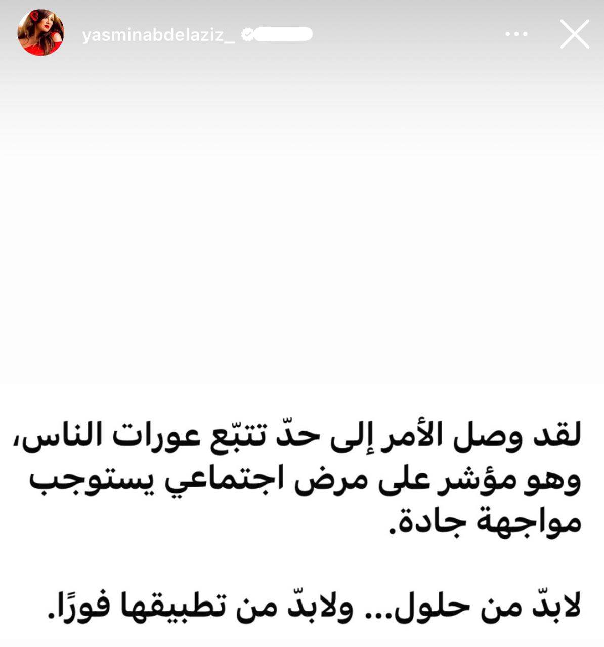 وقالت ياسمين في منشورها: «قد وصل الأمر إلى حد تتبع عورات الناس، وهو مؤشر على مرض اجتماعي يستوجب مواجهة حادة»، مؤكدة بقولها: «لابد من حلول، ولابد من تطبيقها فورًا».
