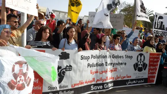 ورفع المحتجون لافتات كتب عليها "أوقفوا التلوث"، مرددين شعارات تطالب بتفكيك مصنع معالجة الفوسفات المملوك للدولة والذي أصبح يتم النظر إليه على أنه السبب الرئيس في المخاطر الصحية في قابس.