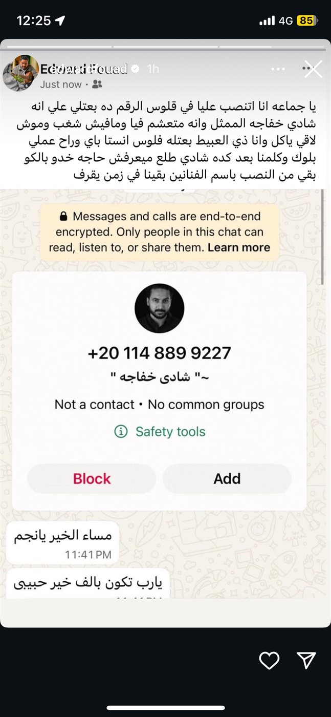 وقال إدوارد في منشوره: “يا جماعة أنا اتنصب عليا في فلوس، الرقم ده بعتلي على أنه شادي خفاجة الممثل، وأنه متعشم فيا، ومافيش شغل، ومش لاقي ياكل، وأنا زي العبيط بعتله فلوس انستا باي، وراح عملي بلوك وكلمنا بعد كده شادي طلع ميعرفش حاجة، خدوا بالكم بقى من النصب باسم الفنانين بقينا في زمن يقرف”.