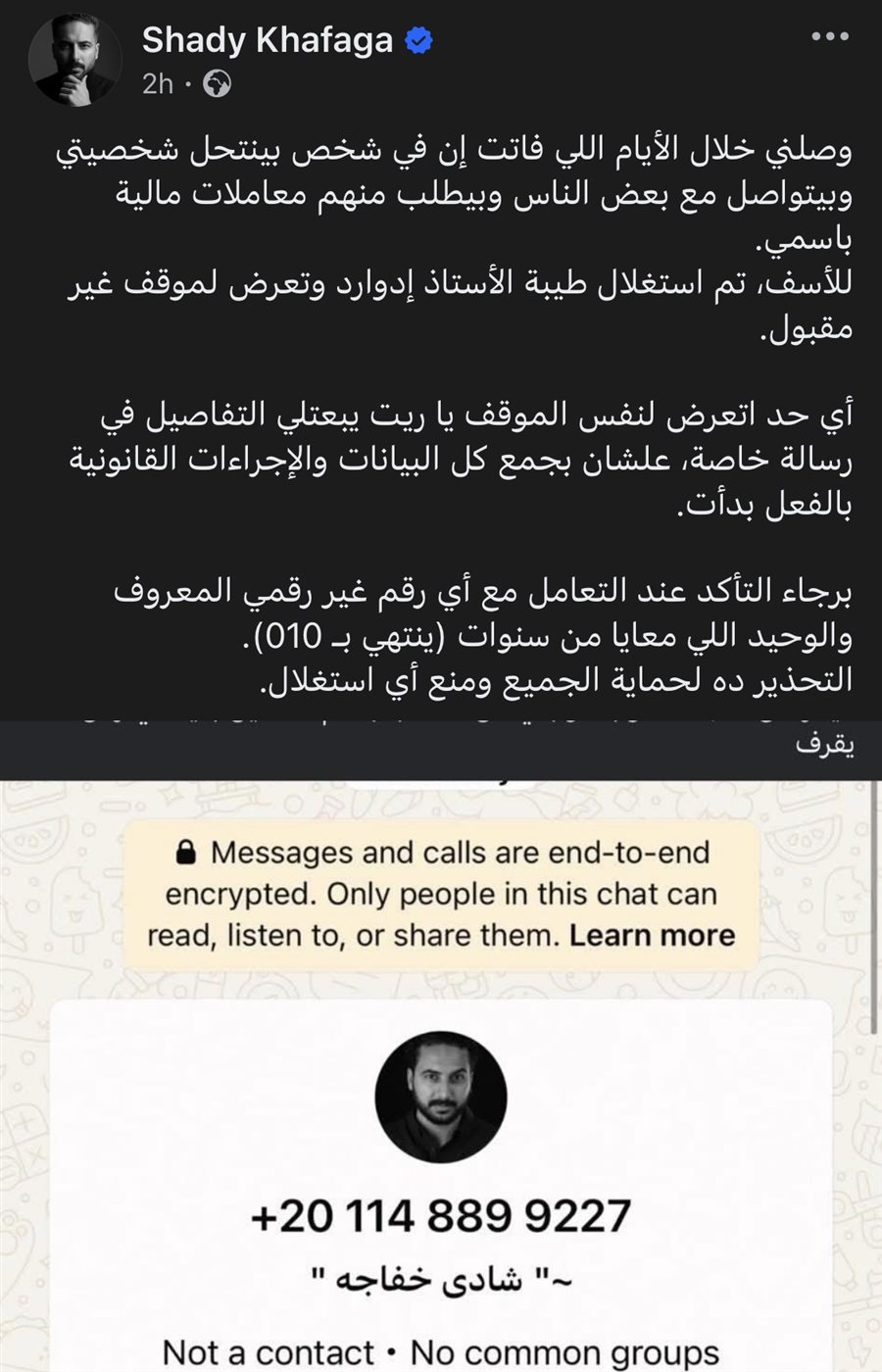 وقال شادي خفاجة في منشوره: “وصلني خلال الأيام اللي فاتت إن في شخص بينتحل شخصيتي وبيتواصل مع بعض الناس وبيطلب منهم معاملات مالية باسمي، للأسف، تم استغلال طيبة الأستاذ إدوارد وتعرض لموقف غير مقبول، أي حد اتعرض لنفس الموقف يا ريت يبعتلي التفاصيل في رسالة خاصة، علشان بجمع كل البيانات والإجراءات القانونية بالفعل بدأت، برجاء التأكد عند التعامل مع أي رقم غير رقمي المعروف والوحيد اللي معايا من سنوات (ينتهي بـ 010)، التحذير ده لحماية الجميع ومنع أي استغلال.”
