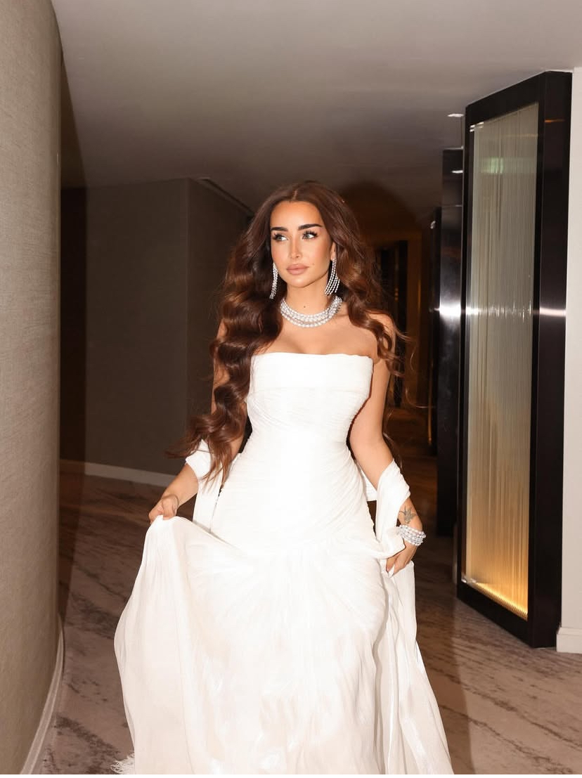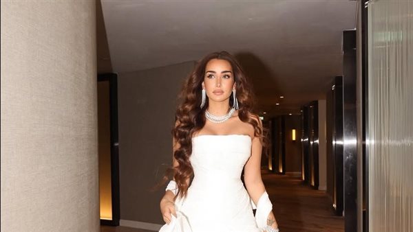 ارتدت الفنانة هنا الزاهد فستاناً طويلاً باللون الأبيض الناصع، مصنوع من قماش فاخر كالساتان، بتصميم عاري الأكتاف يبرز جمال خط الصدر والخصر، مع تنورة درابيه واسعة انسيابية تمنحها طابعاً ملكياً فاخراً.