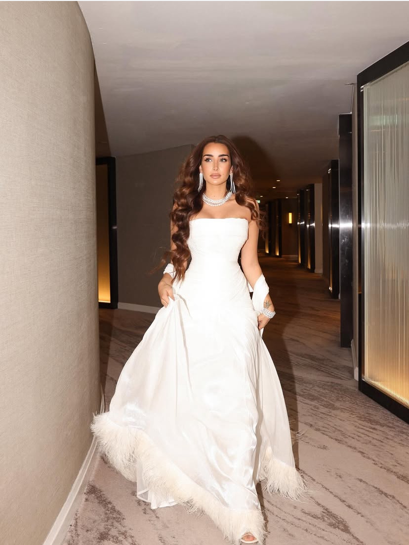 أضافت هنا الزاهد لمسة من الفخامة من خلال الريش الذي زين أطراف الفستان، بالإضافة إلى وشاح خفيف ينسدل على الذراعين بأناقة، مما منح الإطلالة روحاً حيوية ونعومة ساحرة.