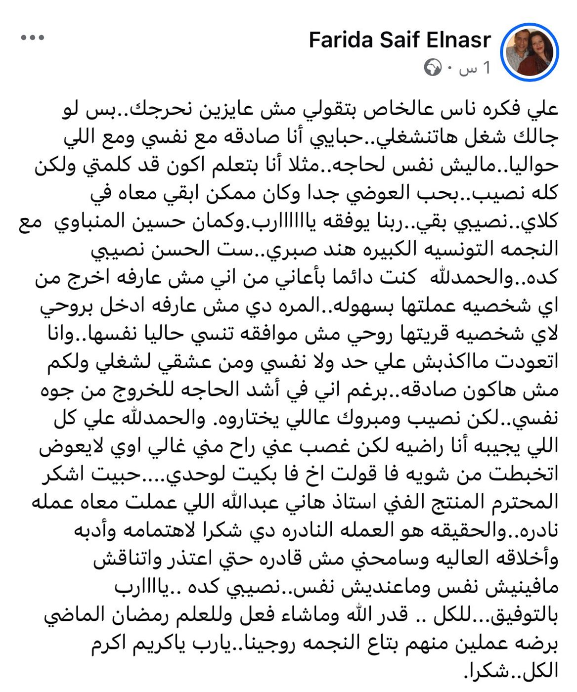 واختتمت: “حبيت أشكر المحترم المنتج الفني أستاذ هاني عبد الله اللي عملت معاه عملة نادرة.. والحقيقة هو العملة النادرة دي شكرا لاهتمامه وأدبه وأخلاقه العالية وسامحني مش قادرة حتى أعتذر واتناقش ما فينيش نفس ومعنديش نفس.. نصيبي كده.. ياااارب بالتوفيق...للكل.. قدر الله وما شاء فعل.. شكرا”.