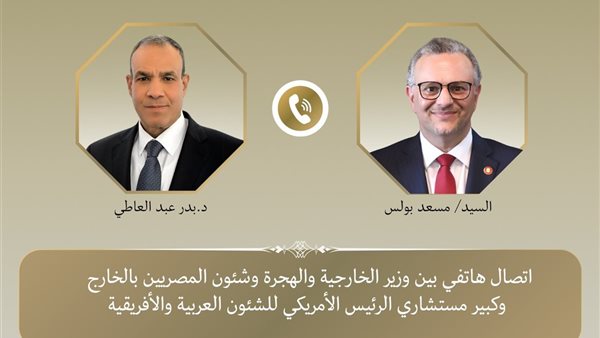 جرى اتصال هاتفى بين الدكتور بدر عبد العاطي وزير الخارجية والهجرة وشئون المصريين بالخارج، مع مسعد بولس كبير مستشاري الرئيس الأمريكي للشئون العربية والأفريقية اليوم السبت.
