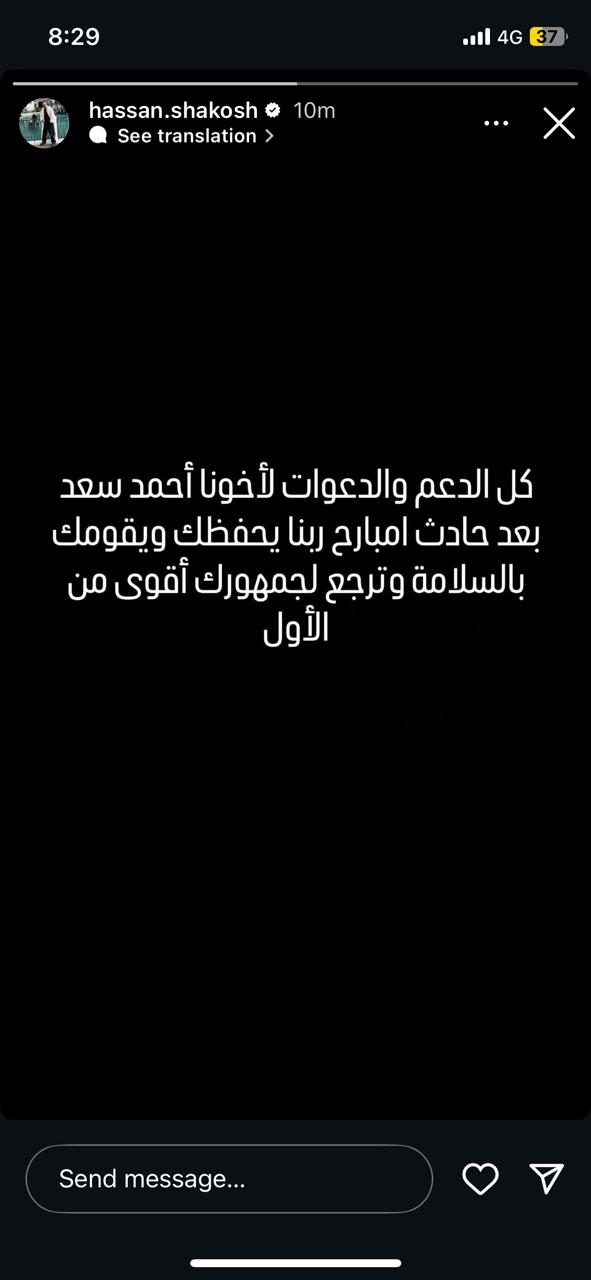 وكتب حسن شاكوش عبر خاصية القصص القصيرة إنستجرام: "كل الدعم والدعوات لأخوانا أحمد سعد بعد حادث امبارح ربنا يحفظك ويقومك بالسلامة وترجع لجمهورك أقوى من الأول".