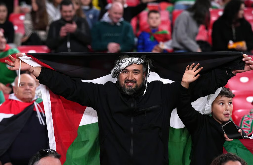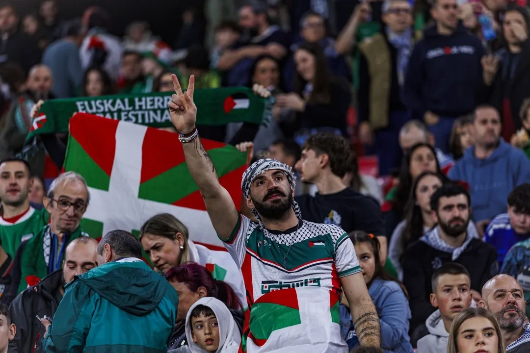 وقال المنظمون إن عدد المشجعين تجاوز 50 ألف شخص، رددوا هتافات مؤيدة لفلسطين ورفعوا لافتات وأعلاما فلسطينية خلال مباراة و دية بين فلسطين ومنتخب إقليم الباسك الإسباني، كما عرضوا صور سليمان العبيد، القائد السابق للمنتخب الفلسطيني، الذي قتلته إسرائيل في غزة أثناء انتظاره مساعدات إنسانية.