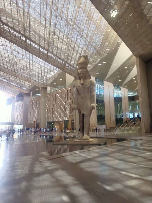 وضع تمثال الملك رمسيس بمنطقة البهو، والذي كان محددا في التصميم الأصلي للمتحف وأنه يوضع تحت مظلة في المنطقة التي تتوسط مبنى العرض المتحفي والمبنى التجاري، وهي مظللة وسقفها مغطى بألواح من الألومنيوم المفرغة التي تحدث كسرا بسيطا لأشعة الشمس وتسمح بحركة الهواء داخل البهو اعتمادا على التهوية والإنارة الطبيعية وتوفيرا لاستهلاك الطاقة ويقلل أيضاً من حدة درجة الحرارة في فصل الصيف، كما أنه تم مراعاة سقوط الأمطار بعمل مسارات لتجميعها في خزان للمياه وإعادة استخدامها في الري.