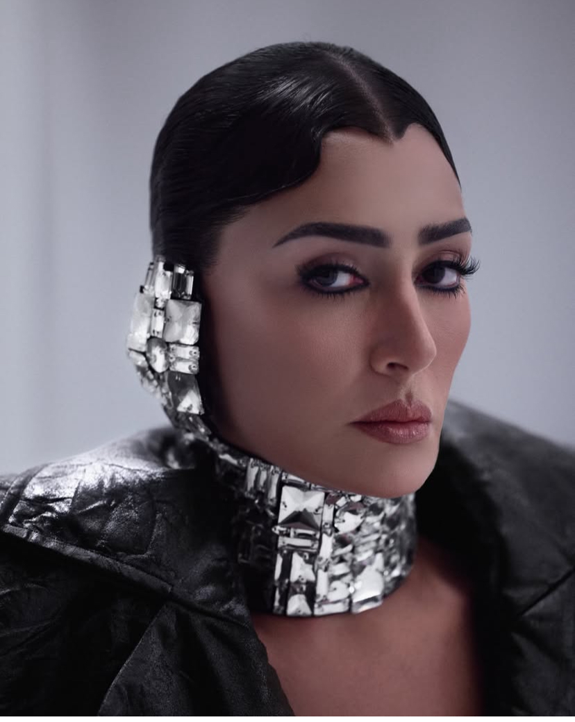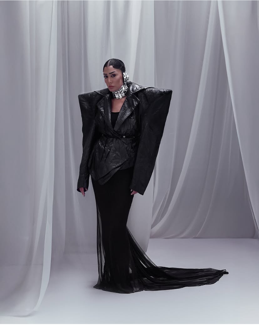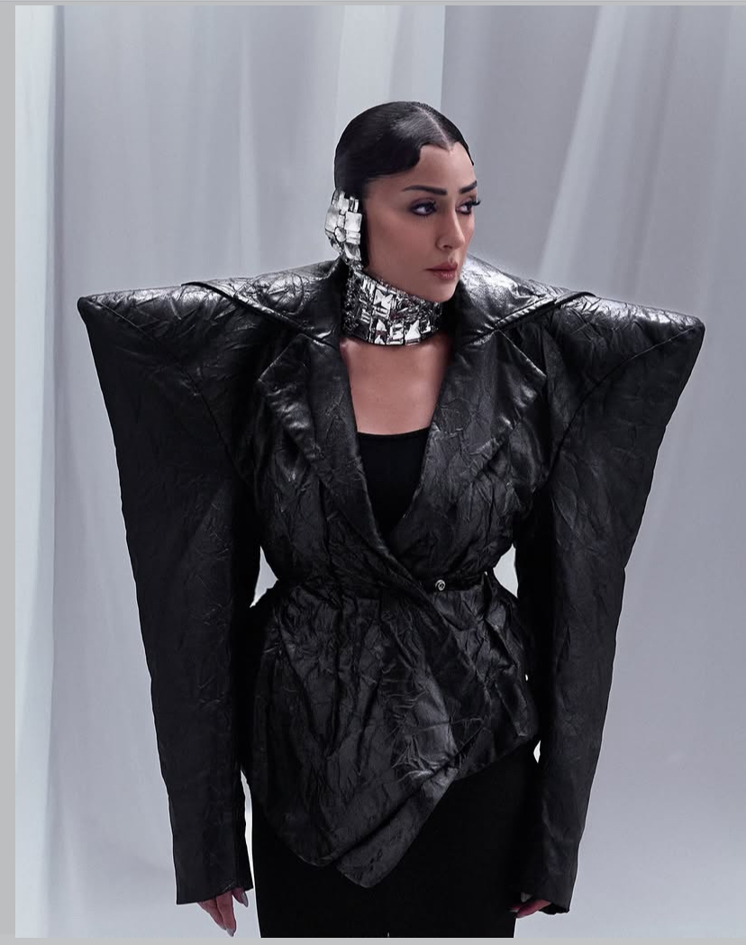 ارتدت الفنانة غادة عبدالرازق فستان أسود اللون منسق مع معطف جلد أسود أيضًا يتميز بأكتاف مدببة ودراماتيكية كبيرة الحجم.