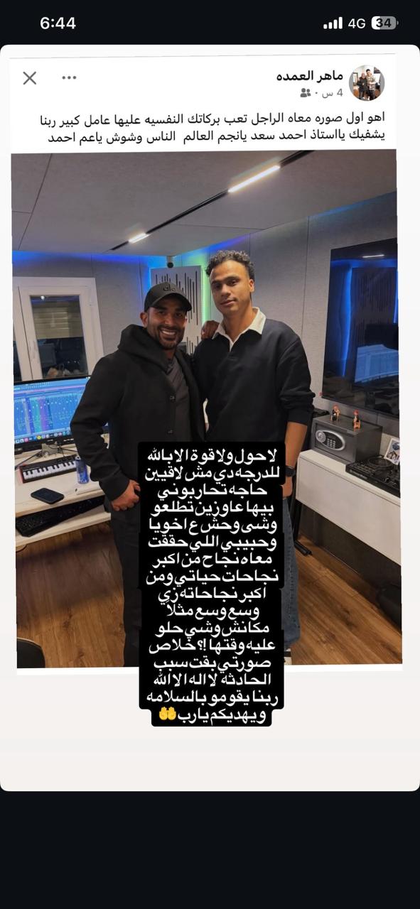 وقال متابع لـ مصطفي حدوتة في منشور عبر موقع التواصل الاجتماعي «فيسبوك»:« أهو أول صورة معاه الراجل تعب.. بركاتك النفسية عليها عامل كبير، ربنا يشفيك يا أستاذ احمد سعد يا نجم العالم، الناس وشوش يا عم أحمد».